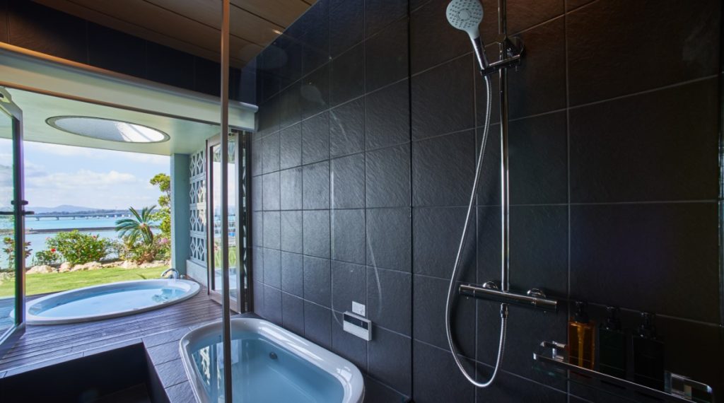 『オーシャンフロントKouriStay(古宇利ステイ)』には写真のように、バスルームの先にジャグジーがあります。その先には海があり、絶景を楽しみながらお湯に浸かる楽しみがあります。