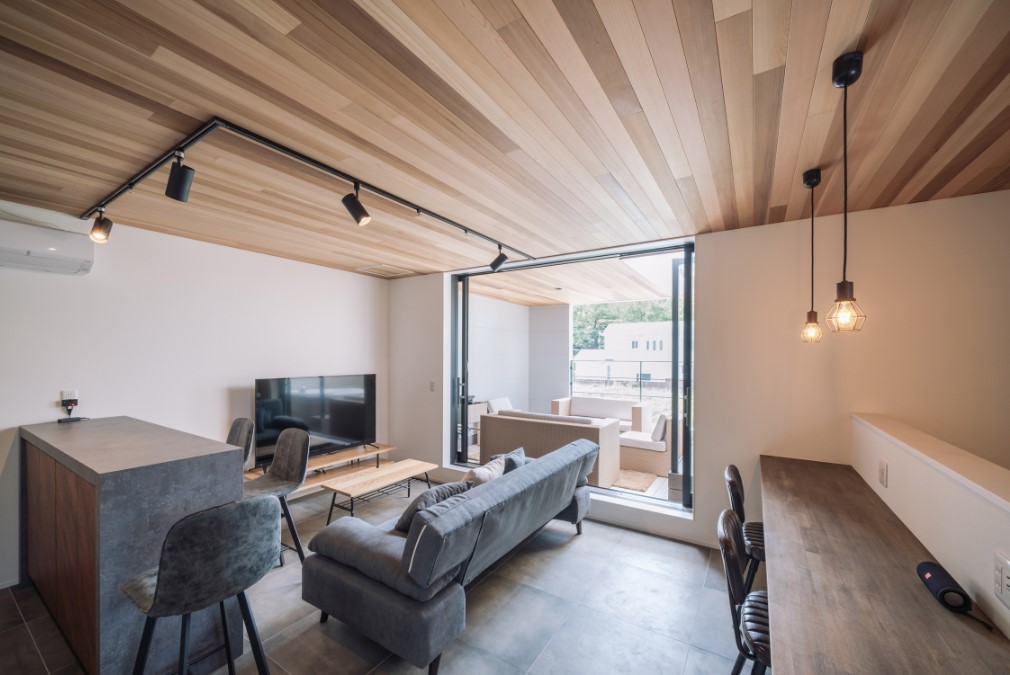 室内は、白を基調としながらも木目やファブリックの温かみを加えた、洗練されたスタイリッシュなインテリア。グレードの高い家具や照明が配置され、まるで海外の高級リゾートに滞在しているかのような雰囲気を味わえます。