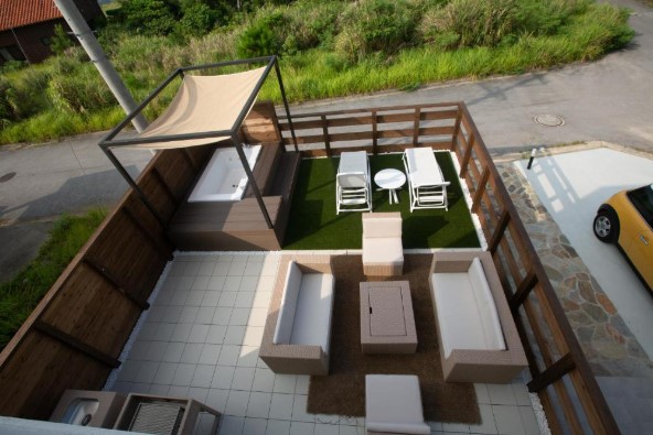 沖縄本島北部、今帰仁村にある、大画面のプロジェクターで映画を見れるのがウリのヴィラです。スタイリッシュですがどこかぬくもりを感じられる内装。90㎡に4名でゆったりすごせて、専用ジャグジーもある「五感が整う」ヴィラです。