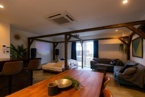 沖縄本島北部、今帰仁村にある、大画面のプロジェクターで映画を見れるのがウリのヴィラです。スタイリッシュですがどこかぬくもりを感じられる内装。90㎡に4名でゆったりすごせて、専用ジャグジーもある「五感が整う」ヴィラです。