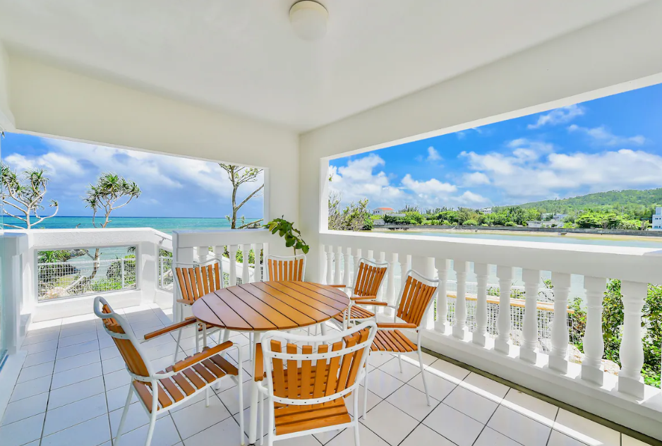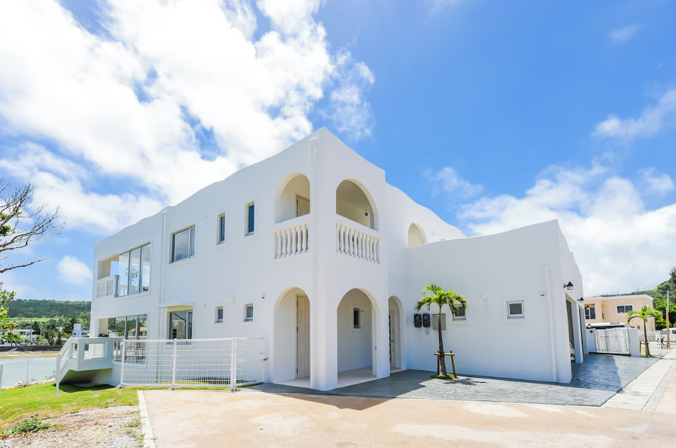 那覇空港から車で約分。沖縄本島中部恩納村にあるビーチ直結の白亜のヴィラです。海辺に直結ですぐそばにはエメラルドグリーンの海。白亜の外観に映えてまるでイタリアの別荘のよう!内部は10人泊まっても広すぎるくらい。豪華な別荘です。