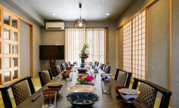 もうひとつは98㎡の2ベッドルームタイプ。シングルベッド2台、二段ベッド3台、ダブルベッド2台を備え、シンプルながらも機能的にまとまった空間です。こちらは和の雰囲気を感じさせるインテリアが特徴で、落ち着いた雰囲気の中でリラックスして過ごせます。小さなお子様連れや、親世代と一緒の滞在にも心地よい空間となっています。