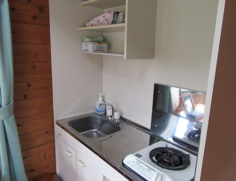 広さは18㎡とそれほど広くないですが、室内にはエアコンや冷蔵庫、ポット、調理用具などが備わり、快適に過ごせる設備が整っています。木の壁と天井に囲まれた空間は、どこか懐かしく落ち着いた雰囲気。