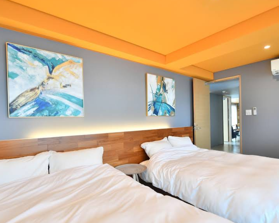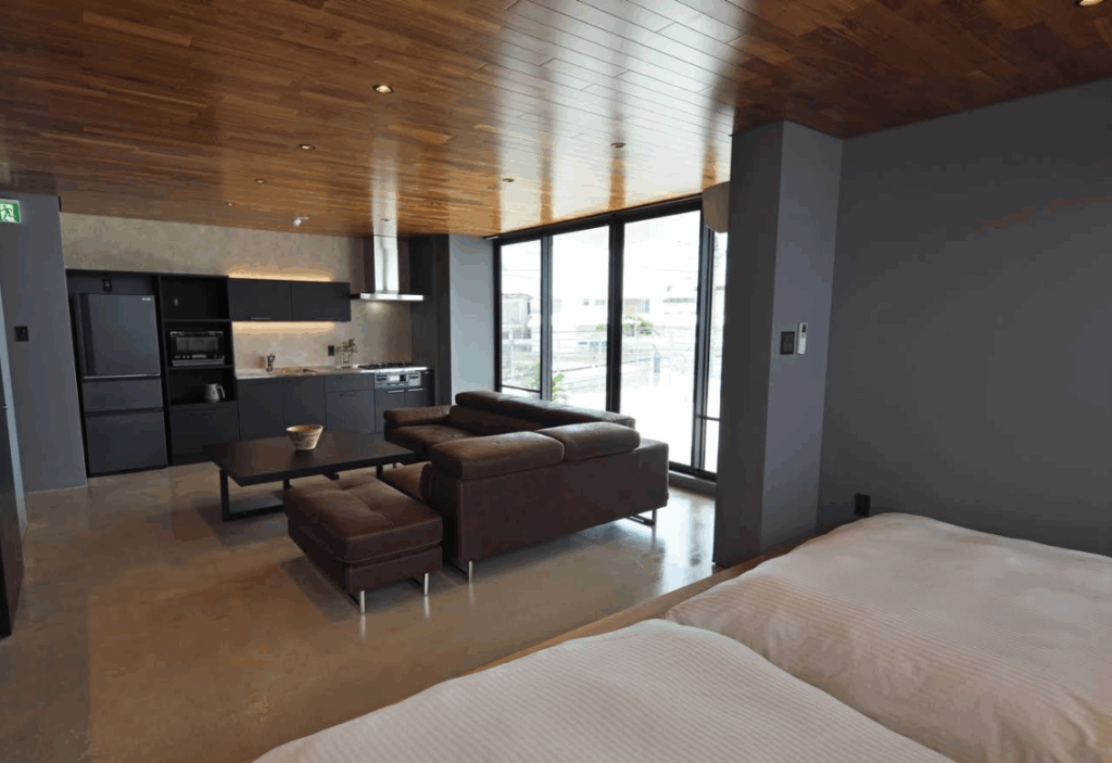 7名用の部屋は、少人数グループや家族旅行にぴったり。リビングとキッチン、ベッドルームがしっかり分かれており、ゆったりとした滞在が叶います。