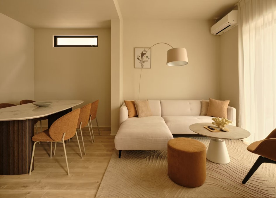1棟貸しのプール付きヴィラは、最大7名まで宿泊可能。広さは約85㎡あり、リビング・ダイニング・ベッドルームをゆったりと配置。モダンでありながら温かみのある内装は、白と木目を基調にした落ち着いたトーンで統一されています。