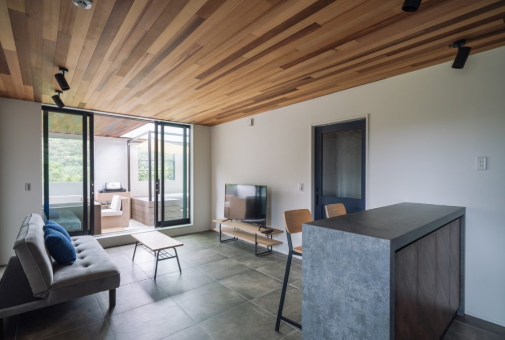 全室が独立したヴィラタイプで、プライベート感たっぷり。ウッドデッキの先にはジャグジーが備えられ、森と海の気配を同時に感じながらゆったりと湯に身を沈めることができます。