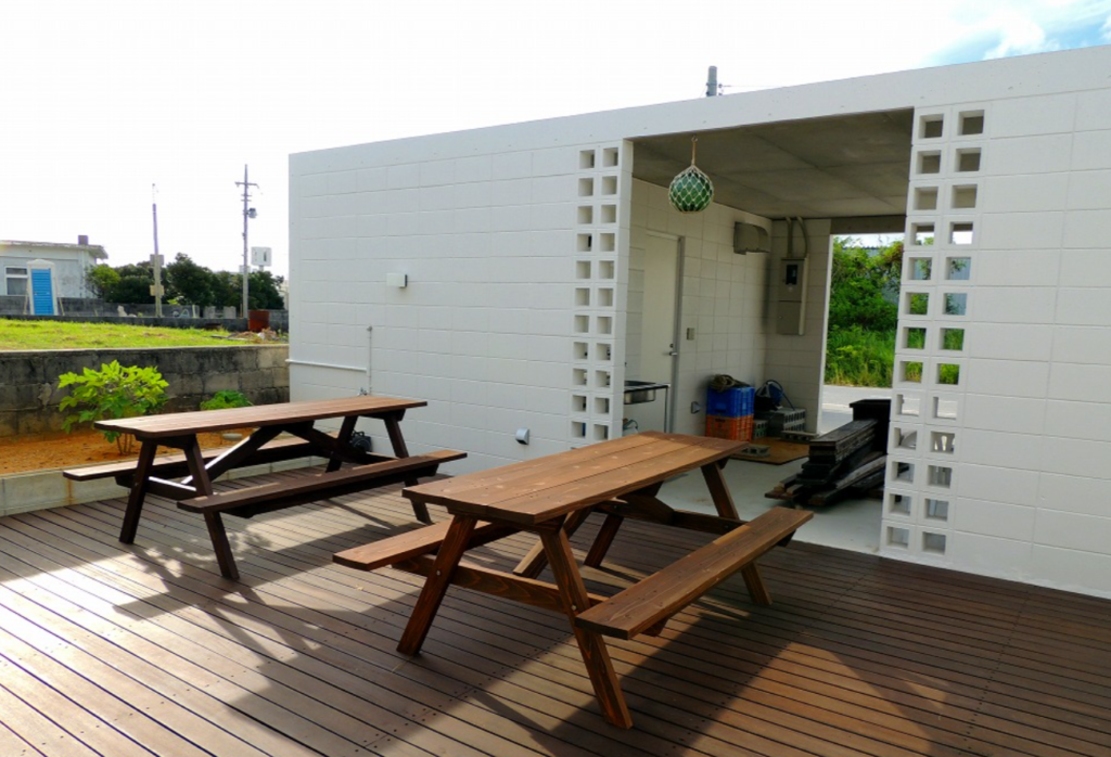 宿の1階には屋根付きの広い駐車スペースが確保されており、雨の日でも荷物の積み下ろしがスムーズ。車での移動がメインとなる平安座島では、この点が非常に便利です。2階に上がると客室エリアがあり、無駄を省いた造りで、気持ちよく過ごせる空間となっています。