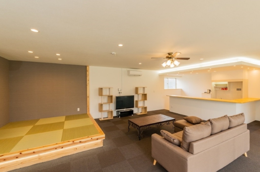 建物は2ベッドルームに広々としたリビングを備えたゆとりある間取り。リビングは開放感があり、家族や仲間全員が集まっても窮屈さを感じにくい空間です。リビングの一角には畳敷きスペースがあり、和の落ち着きも感じられる造りになっています。