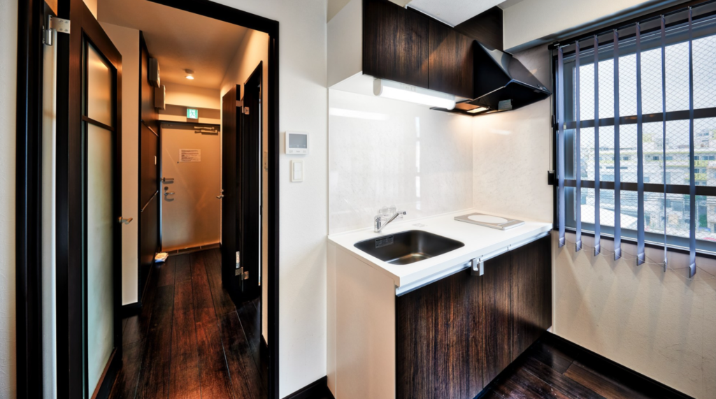 コンパクトな1Kタイプは、一人旅やカップル向けに最適。ベッドルームとリビングスペースが一体となったタイプでも、シンプルながら必要な生活機能はすべて完備しており、冷蔵庫・電子レンジなどの家電はもちろん、調理器具や食器類も揃っています。短期滞在でもストレスなく日常生活が送れるように設計されています。