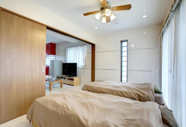Terrace Resort Ginowan” has two types of rooms: a 1K (15㎡) room with a double bed, perfect for a solo traveler, and a 37㎡ twin room with two single beds and a futon set.