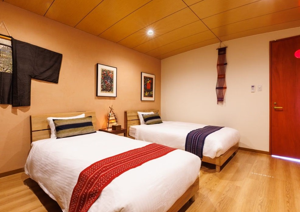 The “bise museum villa” is a two-story villa-style building with two spacious bedrooms. The wooden flooring exudes warmth, and the tastefully arranged furniture and lighting create a comfortable atmosphere.