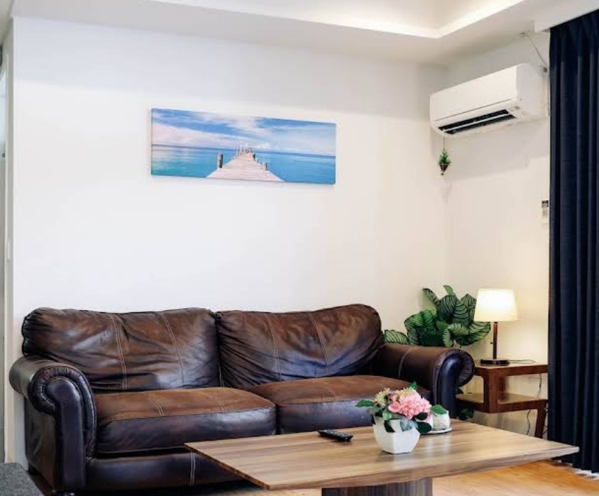 The bathroom has a bathtub, and the kitchen is simple yet functional with an L-shaped layout. The living room has a luxurious sofa, creating a perfect blend of “homey” and “resort-like” atmospheres.