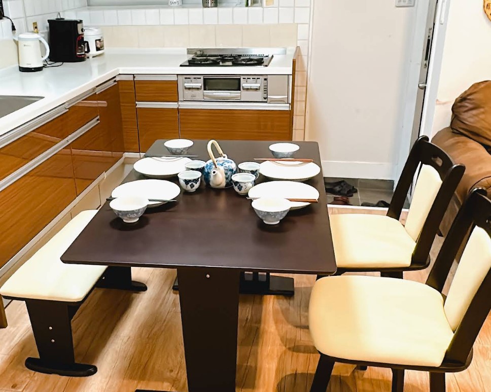 Pension Seiran is a typical single-family home with two to three bedrooms. Futons are provided, and the accommodation can comfortably sleep up to five people. The guest rooms are spacious, measuring over 30 square meters, and are equipped with American-style wooden furniture, flat-screen TVs, and air conditioning for your comfort. The separate building has a washing machine, making it suitable for long-term stays.