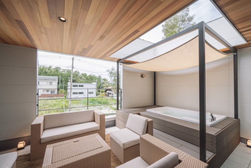 Villa Kanasayukuī features an outdoor wood deck and a small garden space. The terrace area includes a semi-open-air bathtub, a BBQ grill, and resort-style garden sofas and tables.