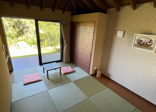 The second is the Japanese-style room. Surrounded by the scent of tatami mats, it offers a traditional atmosphere where you can kick off your shoes and relax comfortably. It’s easy to get around for families with small children or elderly guests, making it perfect for family trips. Okinawa’s nature and Japanese-style space blend together in a mysterious harmony, evoking a sense of nostalgia.