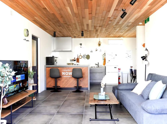 Kokoni chill house is a spacious 112-square-meter villa featuring three bedrooms. It offers ample room for stays with family or groups of friends. Its stylish exterior evokes the feel of an overseas designer home.